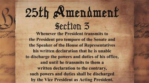 This is where things get really interesting. Section 3 outlines a procedure for when the President is temporarily unable to discharge the powers and duties of their office. The President can voluntarily declare their own inability to serve, informing the President Pro Tempore of the Senate and the Speaker of the House of Representatives in writing. In this case, the Vice President becomes Acting President until the President declares in writing that no inability exists and resumes their duties. This section allows for a smooth transfer of power during periods of presidential illness or incapacitation, without the need for a formal determination of disability by other parties. Think of it as the President saying, “Hey, I need to step back for a bit; the VP’s got this.” It’s a voluntary way for the President to hand over the reins temporarily.