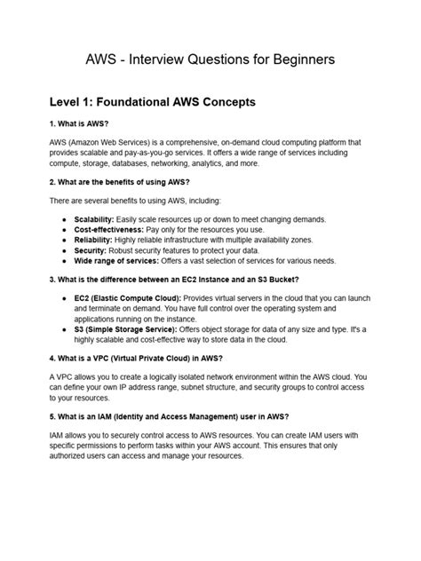 Alright, let’s get down to the brass tacks. Before you even think about specific services, you absolutely need to have a firm grip on the fundamental AWS concepts . This is like the ABCs of cloud computing. First up, Regions and Availability Zones (AZs) . Understand what they are, why they’re important for high availability and disaster recovery, and how you’d choose the right ones for your application. Think about latency, compliance, and cost. Next, Virtual Private Cloud (VPC) . This is your own isolated section of the AWS cloud. You need to know about subnets (public vs. private), route tables, security groups, network ACLs, and how to set up secure network connectivity. Identity and Access Management (IAM) is another biggie. How do you manage users, groups, roles, and permissions securely? This is crucial for preventing unauthorized access. Understanding the principle of least privilege is key here. Don’t forget Compute services , primarily EC2 (Elastic Compute Cloud) . Know about instance types, AMIs, EBS volumes, load balancing (ELB), and auto-scaling. You should be able to explain how to launch, configure, and manage EC2 instances. Storage services are vital too. S3 (Simple Storage Service) is the workhorse for object storage – know its different storage classes, versioning, lifecycle policies, and security. For block storage, you’ve got EBS , and for file storage, EFS . Databases are essential – understand RDS (Relational Database Service) for managed relational databases (like MySQL, PostgreSQL) and DynamoDB for NoSQL. Finally, know about basic monitoring with CloudWatch and logging with CloudTrail . These services are fundamental for understanding the health and activity within your AWS environment. Your interview answers should demonstrate a clear understanding of why these services exist and how they contribute to a robust, scalable, and secure cloud architecture. Don’t just recite definitions; explain the use cases and benefits.