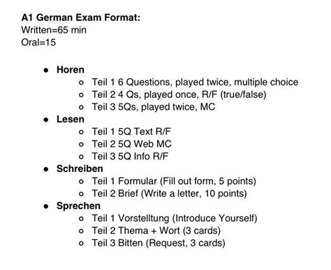 The exam usually covers four key areas: Reading (Lesen), Listening (Hören), Writing (Schreiben), and Speaking (Sprechen) . Each section assesses different skills, and it’s important to prepare for all of them. For instance, the reading section might involve understanding short, simple texts like signs or notices. The listening section could include conversations about everyday topics. The writing section usually requires you to fill out forms or write short messages. Finally, the speaking section involves introducing yourself, asking simple questions, and responding to basic prompts. Knowing what to expect in each section is half the battle, guys!