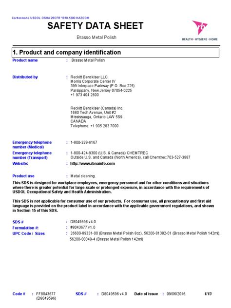Alright, guys, before we get our hands dirty (or shiny!), let’s talk about the Brasso Safety Data Sheet (SDS) . Think of the SDS as your user manual for Brasso. It’s packed with crucial information about the product’s hazards, safe handling procedures, and what to do in case of emergencies. It’s super important to read and understand the SDS before using any chemical product, and Brasso is no exception. This document is a critical tool for ensuring your safety and protecting yourself from potential risks. The Brasso SDS provides detailed information on the ingredients, potential health hazards, and first aid measures. It also outlines proper storage and disposal procedures, which are essential for environmental safety. When you are using Brasso metal polish , always remember that it is a chemical product, and thus, needs to be handled with care. The SDS provides specific instructions to minimize exposure and prevent adverse health effects.