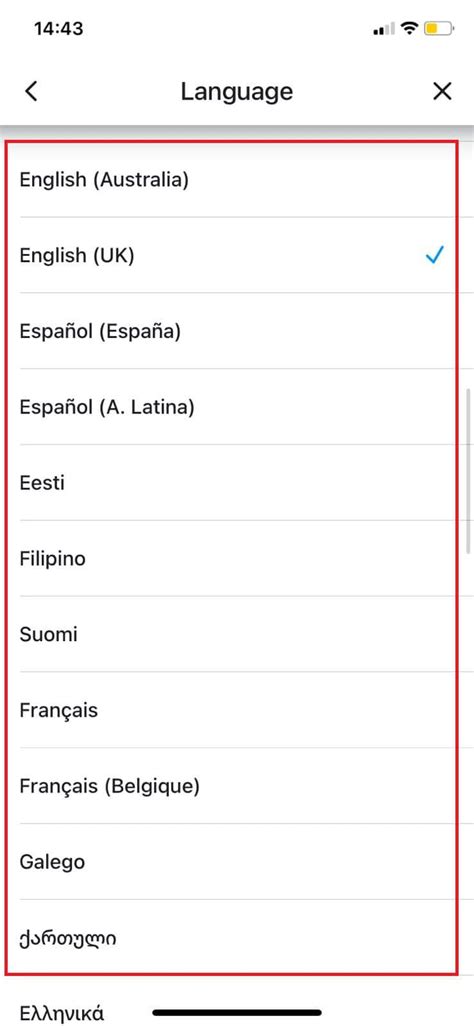 • In the language selection menu, you’ll see a list of available languages. Scroll through the list until you find “English.” Once you’ve found it, tap on “English” to select it as your preferred language. The app might take a few seconds to update the language settings.