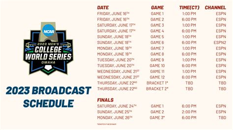 • NCAA Website: The official NCAA website ( www.ncaa.com ) also provides a schedule of the College World Series games. Look for the baseball section and navigate to the tournament schedule.