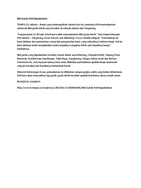 - Kenapa ini bagus? Karena langsung to the point. Kita tahu ada kebakaran hebat ( what ), lokasinya di pabrik kertas Tangerang ( where ), dan dampaknya ada 5 pekerja terluka ( who & impact ). Jelas, ringkas, dan informatif.