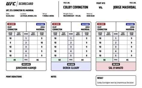 In the final round, the Colby Covington vs Jorge Masvidal scorecard was really being solidified. Colby Covington continued his game plan, focusing on wrestling and control . He secured early takedowns, demonstrating his commitment to the strategy that had been working throughout the fight. Jorge Masvidal knew he needed a finish, but the wrestling pressure from Covington made it incredibly difficult for him to mount any significant offense. While Masvidal showed heart and tried to land some strikes, Covington’s ability to get the fight to the ground and keep it there was the story of the fight. Even late in the round, Covington managed to secure takedowns, ensuring he controlled the momentum and the clock. The judges had a clear picture: Covington’s consistent grappling, control time, and takedowns far outweighed Masvidal’s moments of striking offense. This round, like many others, favored Covington due to his dominant wrestling . When the final horn sounded, the scorecards reflected this dominance. All three judges scored the fight 30-26 in favor of Colby Covington. This unanimous decision victory highlighted Covington’s effective game plan and his ability to neutralize Masvidal’s striking threat with his superior wrestling. The Colby Covington vs Jorge Masvidal scorecard wasn’t controversial; it was a clear reflection of the fight’s action, with Covington controlling the vast majority of the fight through his grappling. Masvidal had his moments, particularly with his striking, but he couldn’t sustain it or stop Covington’s takedowns. The scorecards told the story: Covington dominated the fight where it mattered most to the judges – on the ground.