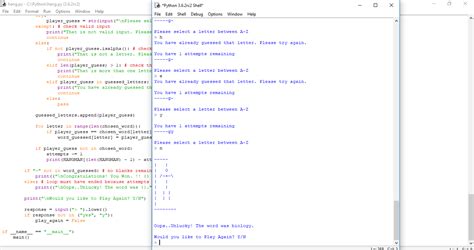 We need to validate the input. It should be a single alphabetical character and not something already guessed. If it’s invalid, we should tell the player and continue to the next iteration of the loop without deducting an attempt: