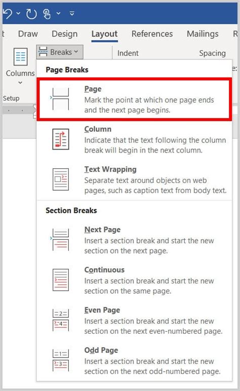 4. Choose “Page” under Page Breaks: A dropdown menu will appear with different types of breaks. Under the “Page Breaks” section, select “Page.” This will insert a regular page break at your cursor’s location.