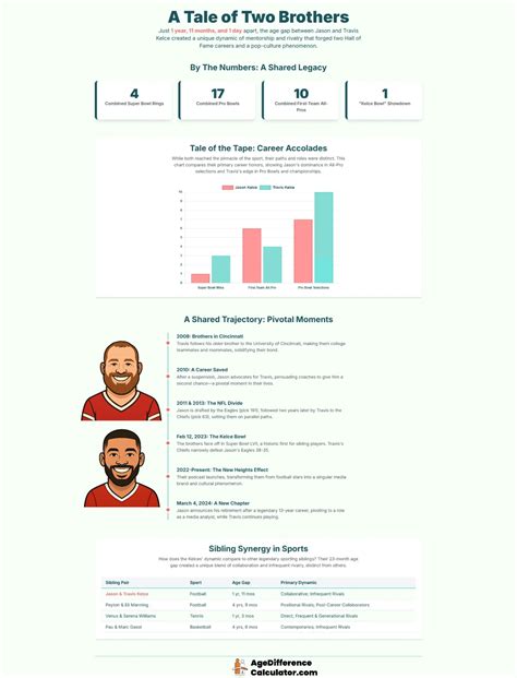 What’s the deal with the Kelce brothers, guys? We’re talking about Jason Kelce and Travis Kelce , two absolute legends in the NFL. One’s a soon-to-be-retired icon, the other a superstar tight end still dominating the game. Naturally, a lot of you are curious about the Jason Kelce Travis Kelce age difference . It’s a pretty common question, and honestly, it’s not as big as some people might think. Knowing their ages can really give you a cool perspective on their careers, how they’ve grown up together, and how they’ve managed to reach the pinnacles of professional football. So, let’s dive deep into this, unpack their birthdates, and figure out just how many years separate these two incredible athletes. It’s always fascinating to see how a small age gap can influence sibling dynamics, especially when they’re both titans of the same sport. We’ll look at their timelines, their journeys to the NFL, and how their relatively close ages might have played a role in their shared success and the bond they clearly have.