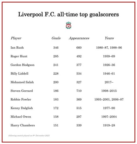 What’s up, footy fanatics! Today, we’re diving deep into the hallowed halls of Anfield to talk about something truly special: the Liverpool all-time top scorers wiki . This isn’t just about numbers, guys; it’s about legends, about heroes who etched their names into the very fabric of this iconic club. We’re talking about players who didn’t just score goals, but who embodied the spirit of Liverpool, who gave their all, match after match, season after season. So, grab your scarves, settle in, and let’s relive the magic of the Reds’ greatest goal-getters. This list is a testament to the incredible talent that has graced the Merseyside turf, a roll call of royalty in the red shirt. We’ll explore who sits at the pinnacle of this prestigious chart, who are the consistent performers, and how the landscape of goal-scoring has evolved over the decades at one of England’s most storied football clubs. It’s a journey through history, celebrating the strikers, midfielders, and even defenders who found the back of the net with uncanny regularity, contributing to Liverpool’s rich trophy cabinet and its enduring legacy in the game. Whether you’re a lifelong Red or just appreciate footballing history, this deep dive into Liverpool’s scoring titans is bound to be a fascinating ride, offering insights into the players who defined eras and inspired generations of supporters. We’ll also touch upon the statistical nuances, the different eras of football, and how scoring has changed, but at its heart, this is a celebration of individual brilliance and collective success driven by the men who knew how to find the goal.