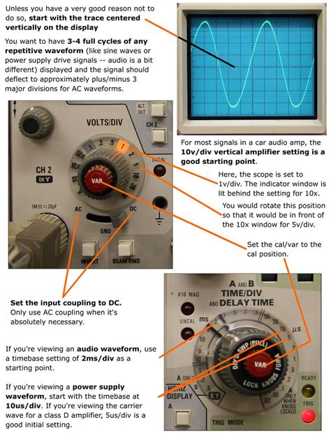 Alright, enough theory! Let’s talk about actually using this beast. We’ll cover some fundamental measurements that you’ll be doing all the time. First things first: connecting your probe . Make sure the oscilloscope is turned off, connect your probe to one of the input channels (e.g., CH1), and connect the ground clip to a known ground point in your circuit. Never connect the ground clip to a positive voltage, as this can cause a short circuit! Once everything is connected, turn on your oscilloscope and your circuit. If you’re measuring an AC signal, you’ll likely want to set the input coupling to ‘AC’ for the channel. This blocks any DC component, letting you see only the AC part. If you want to see the total signal (AC + DC), use ‘DC’ coupling. For digital signals or general troubleshooting, ‘DC’ is often preferred. Now, let’s talk about getting a stable waveform. This is where the trigger controls become your best friend. Start by setting the trigger mode to ‘Auto’. This means the scope will try to display a waveform even if there’s no valid trigger signal. Then, adjust the trigger level knob so the trigger line (often a different colored horizontal line on the screen) intersects the waveform you want to capture. You might also need to adjust the slope (rising or falling edge). If you still don’t see a stable waveform, try adjusting the time base (s/div) and volts per division (V/div) . Start with a mid-range setting for both and adjust as needed. If the waveform is too fast horizontally, decrease the s/div. If it’s too slow, increase it. If the waveform is too big vertically, increase the V/div. If it’s too small, decrease it. Common measurements include amplitude (the peak voltage of the signal) and frequency (how often the signal repeats). You can often read these directly from the screen using the graticule (the grid lines), measuring the height for amplitude (remembering your V/div setting) and the width for frequency (measuring the period and calculating frequency = 1/period, using your s/div setting). Many modern scopes also have automatic measurement functions that can display these values directly on the screen, which is super handy! Don’t be afraid to play around with the settings – that’s the best way to learn. Just remember to return to sensible defaults if you get lost!