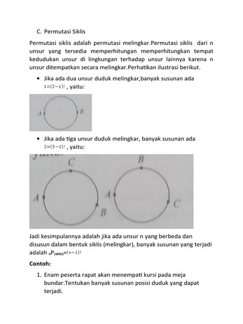 Nah, sebelum kita loncat ke permutasi siklis, ada baiknya kita refresh sedikit tentang apa itu permutasi secara umum. Jadi, permutasi itu intinya adalah cara menghitung berapa banyak urutan berbeda yang bisa kita buat dari sejumlah objek. Misalnya, kalau kita punya tiga huruf, A, B, dan C, kita bisa susun jadi ABC, ACB, BAC, BCA, CAB, CBA. Itu semua adalah permutasi dari ketiga huruf tersebut. Rumusnya sih simpel, n! (n faktorial), di mana n adalah jumlah objeknya. Jadi, untuk 3 objek, permutasinya ada 3! = 3 x 2 x 1 = 6 cara.