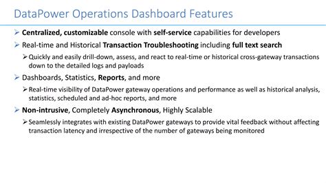The dashboard boasts a range of features designed to simplify and streamline your DataPower management. It enables real-time monitoring. You get a live view of your DataPower appliances’ health and performance. There are also alert and notification capabilities. You can set up alerts to notify you of critical events or performance issues. You can customize the dashboard. Tailor the dashboard to show the metrics and information that are most important to you. The dashboard has in-depth reporting. Generate reports on performance, security, and other key metrics. And it provides audit logging. Track user activity and changes within the DataPower environment. With its ability to provide real-time monitoring and its reporting capabilities, you can have insights into what is happening across your environment. With the ability to create custom alerts, you can proactively resolve potential issues before they can cause service disruptions. The dashboard’s audit logging features also ensure that you can track user activity and any changes. This is important for security and compliance. The features combined can simplify your DataPower management, making it easier to keep your systems running smoothly and securely. So, whether you’re a seasoned DataPower pro or just starting out, the dashboard is a must-have tool for effective management. It provides a central location for monitoring and managing all of your DataPower appliances from one place.