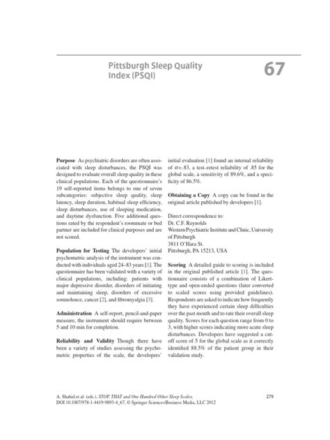 Alright, so what is this PSQI thing anyway? The Pittsburgh Sleep Quality Index is basically a questionnaire designed to measure the quality of your sleep over the past month. Think of it as a snapshot of your typical sleep habits. It was developed way back in 1988 by Dr. Daniel Buysse and his team at the University of Pittsburgh (hence the name!). The PSQI isn’t just about how long you sleep; it digs deeper into various aspects of your sleep experience. It looks at things like how long it takes you to fall asleep ( sleep latency ), how often you wake up during the night ( sleep disturbances ), how long you actually spend sleeping while in bed ( sleep efficiency ), and how your sleep affects your daytime functioning. The questionnaire is made up of 19 self-rated questions and five questions that a bed partner (if you have one) can answer. However, the scoring is based only on the self-rated questions. These questions are grouped into seven different components, each giving you a score from 0 to 3. These components are: Subjective Sleep Quality, Sleep Latency, Sleep Duration, Habitual Sleep Efficiency, Sleep Disturbances, Use of Sleeping Medication, and Daytime Dysfunction. By looking at all these different areas, the PSQI gives you a pretty comprehensive picture of your sleep quality. It’s not just about whether you think you’re sleeping well, but about getting some actual data to back it up. This is super useful because sometimes what we think is happening with our sleep and what’s actually happening can be totally different!