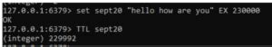 Here, mykeyex is set to “World” and will expire in 30 seconds. The TTL command confirms this.
