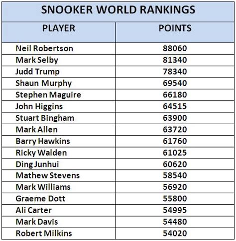 Other notable players include Neil Robertson , with his smooth cue action and prolific scoring, and John Higgins , a legend of the game with a wealth of experience and skill. These players have all consistently performed at the highest level, accumulating ranking points and maintaining their positions among the elite. The competition among these top players is fierce, with each match carrying significant implications for the rankings. They are constantly battling for supremacy, with every tournament providing opportunities to gain ground. These players represent the pinnacle of snooker , and their performances in 2023 have been nothing short of spectacular, providing fans with countless moments of excitement and skill.